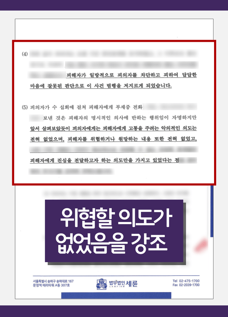사건 이후 추가적인 연락이나 접근이 전혀 없었고, 본인 스스로 행위의 문제점을 인식하고 반성하고 있다는 점을 통해 향후 재발 위험이 없다는 점을 분명히 했습니다.