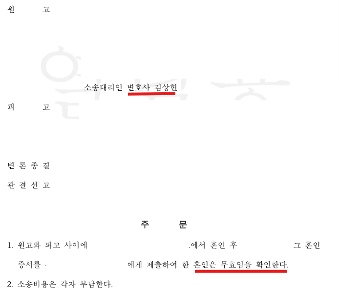 그 결과, 재판부는 본 변호사의 주장을 전부 받아들여, “원고와 피고 사이의 혼인은 무효임을 확인한다.”라는 원고 전부 승소 판결을 선고하였습니다.