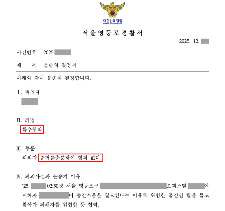 즉, 특수협박이라는 중대한 범죄 혐의에 대해 형사처벌 없이 사건이 종결된 결과입니다.
