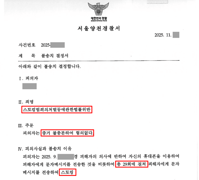 결과적으로, 29회 반복 연락이라는 불리한 사실관계가 있었음에도 불구하고, 스토킹처벌법 위반 혐의 자체를 부정하여 무혐의 처분을 이끌어낸 사례입니다.