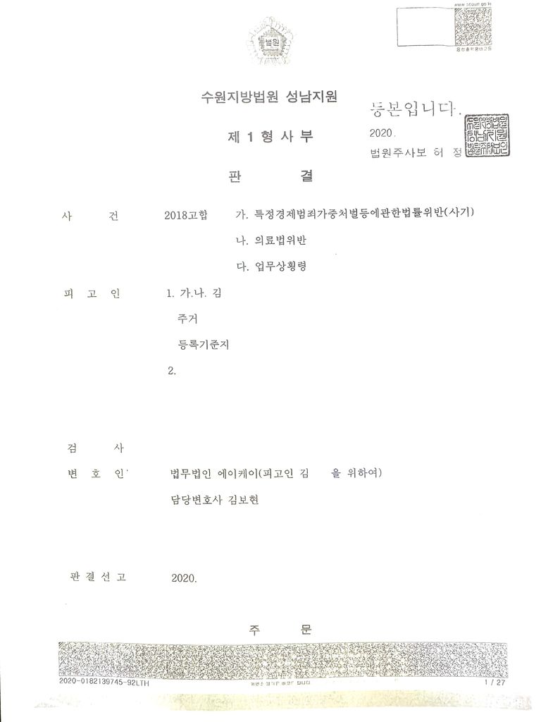 결국 법원도 본 변호인의 주장을 받아들여 피고인이 허위로 발기인, 조합원을 모집하거나 출자금 납입을 가장하여 형식적으로만 생협을 설립함으로써 의료사업으로 가장하였다고 인정하기에 부족하다고 판시하고 무죄를 선고하였고, 이에 대하여 검찰은 항소하였으나 항소기각 판결이 선고되었는바, 의뢰인은 실형 선고 및 요양급여비용 상당액의 환수처분을 받을 위험에서 벗어나게 됨.