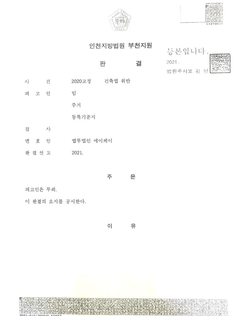 결국 법원도 본 변호인의 주장을 받아들여 피고인이 건축허가조사 및 검사조서에 허위의 기재를 하였다고 볼 수 없다는 이유로 무죄를 선고하였고, 검찰도 항소를 포기함으로써 1심만으로 의뢰인의 무죄가 확정되어 건축사인 의뢰인으로 하여금 명예를 회복하게 하고, 징계의 위험에서도 신속히 벗어나게 함.