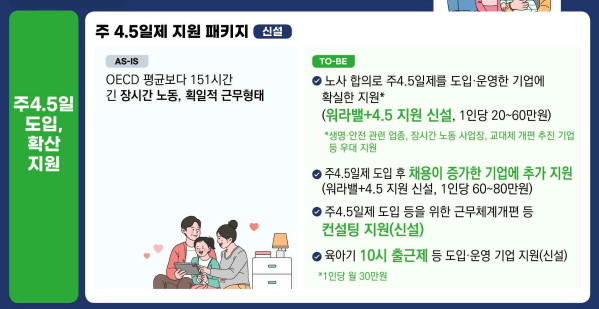 노사 합의에 따라 4.5일제를 도입하여 운영하는 기업에는 1인당 20만~60만원 지원금이 책정됩니다.