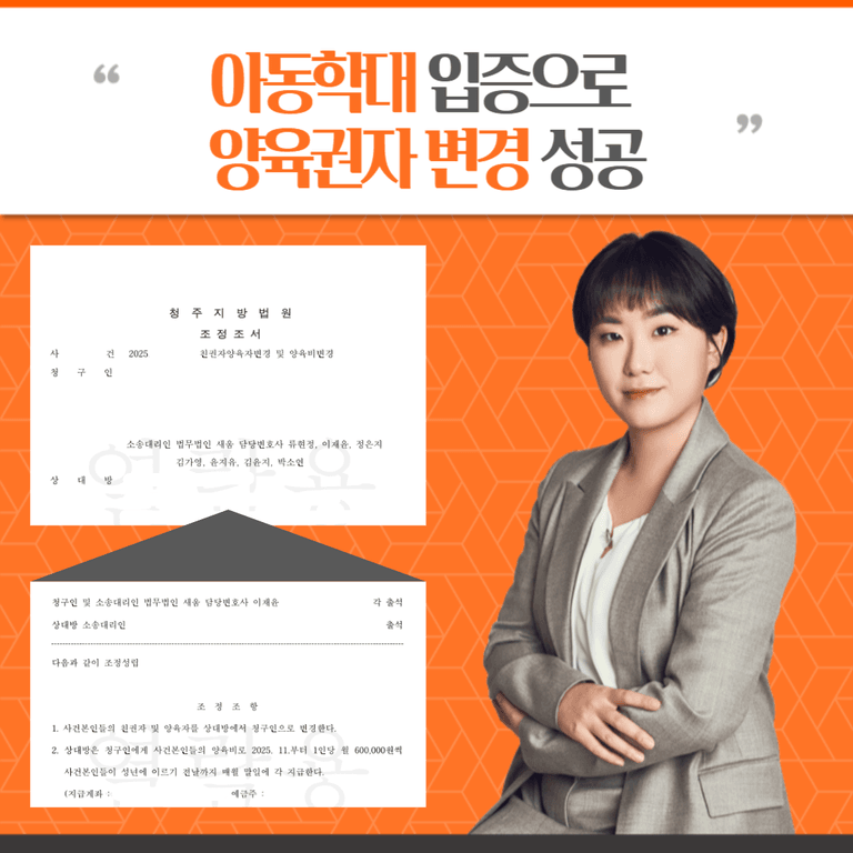 이미 1년 전 보호처분으로 종결된 아동학대 사실은 자칫 ‘지나간 일’로 치부될 수 있었습니다. 그러나 새움은 이를 단순한 과거의 기록으로 두지 않고, 상대방의 반복되는 훈육 태도와 자녀에게 미치는 심리적 악영향을 논리적으로 연결했습니다. 결국 법원으로부터 현재의 양육권자가 자녀의 성장에 방해가 된다는 판단을 이끌어내며, 간절했던 친권·양육권 탈환에 성공했습니다.