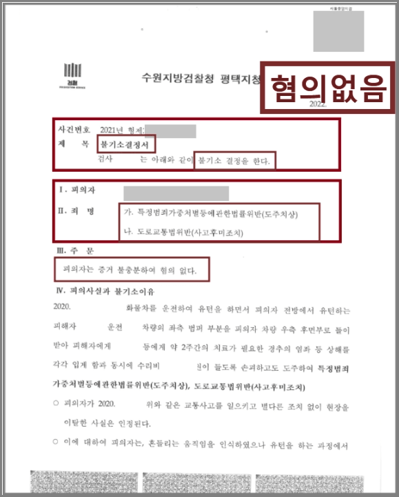 그 결과 의뢰인은 형사처벌이나 전과 기록 없이 억울하게 제기되었던 도주치상 혐의에서 벗어나