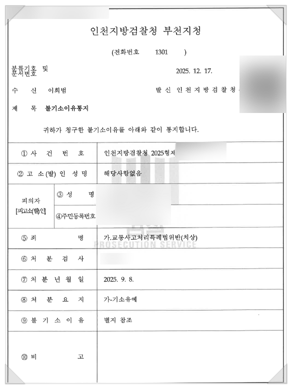 이 사고로 피해자는 약 2주간의 치료를 요하는 상해를 입었으며, 이에 따라 의뢰인은 교통사고처리특례법상 치상 혐의로 수사를 받게 되었습니다.