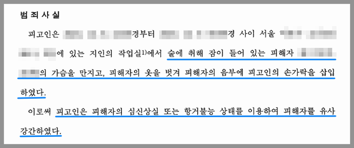 그런데 S는, 피해자가 자신의 옆에서 잠을 자고 있는 것을 보고 순간적으로 잘못된 충동을 억누르지 못한 채, 피해자의 가슴을 만지고 음부에 손가락을 넣는 행동을 하고 말았습니다. 이후 피해자의 신고로 S는 준유사강간 혐의로 조사를 받고 재판에 넘겨지게 되었습니다.