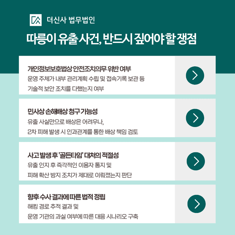 정보통신망법과 개인정보 보호법의 교집합에서 운영 주체가 기술적인 방어벽을 충분히 세웠는지, 그리고 사고 발생 후 피해 확산을 막기 위한 골든타임을 놓치지는 않았는지가 핵심 쟁점입니다.
