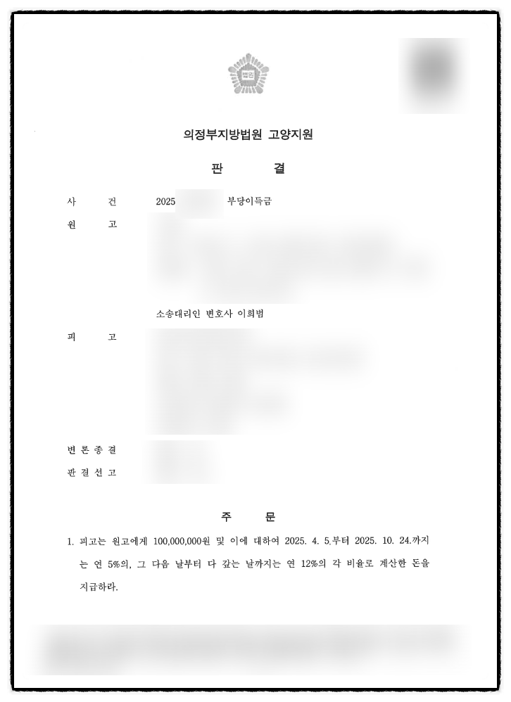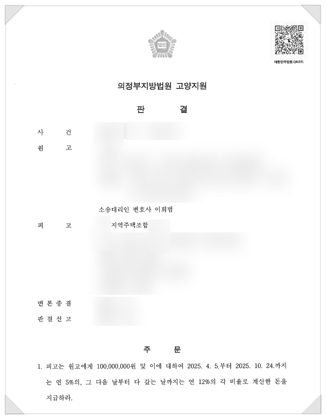 이에 따라 법원은 조합가입계약의 무효를 인정하여 의뢰인에게 납부한 1억 원 전액의 반환을 명령하였으며, 또한 소송비용 역시 전부 피고 조합에게 부담시키는 결정을 내렸습니다.