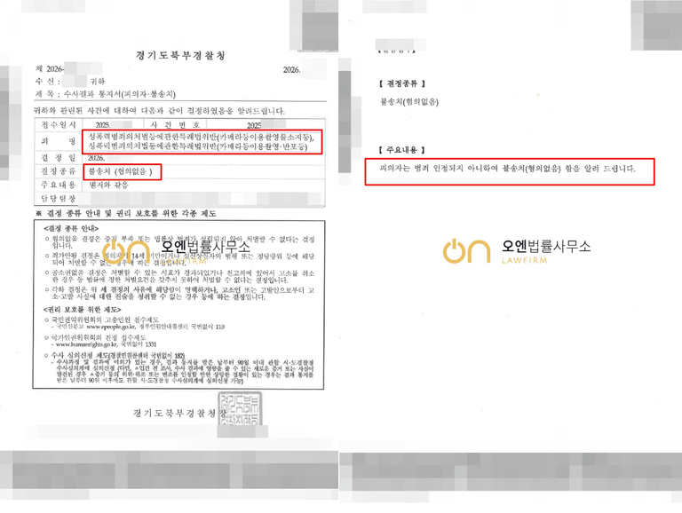 경찰은 오엔법률사무소의 주장을 받아들여, 범죄 인정되지 아니한다고 판단하여 성폭법위반(카메라이용촬영물 소지, 반포등) 혐의에 대해서 불송치 결정을 내렸습니다.