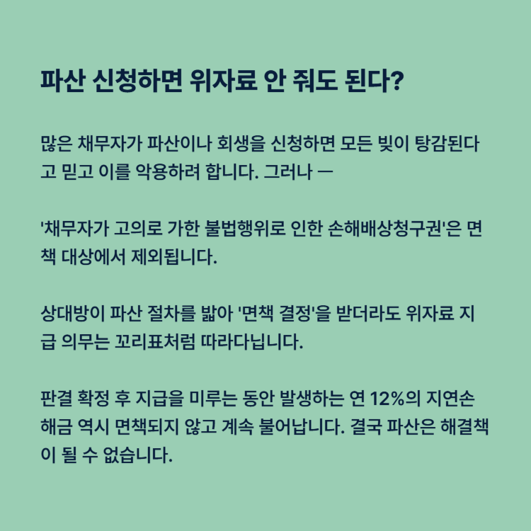 판결 확정 후 지급을 미루는 동안 발생하는 연 12%의 지연손해금 역시 면책되지 않고 계속 불어납니다. 결국 파산은 해결책이 될 수 없습니다.