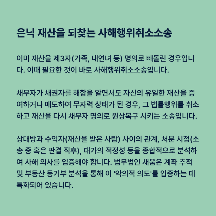 상대방과 수익자(재산을 받은 사람) 사이의 관계, 처분 시점(소송 중 혹은 판결 직후), 대가의 적정성 등을 종합적으로 분석하여 사해 의사를 입증해야 합니다. 법무법인 새움은 계좌 추적 및 부동산 등기부 분석을 통해 이 '악의적 의도'를 입증하는 데 특화되어 있습니다.