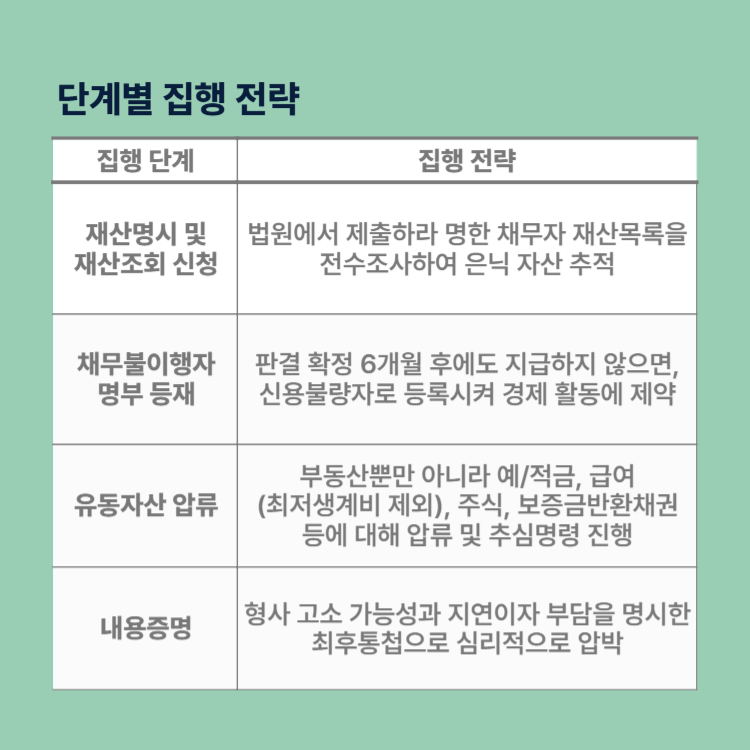단순히 기다린다고 해서 돈이 들어오지는 않습니다. 판결문이라는 무기를 들고 즉각적이고 다각적인 공세를 펼쳐야 합니다.