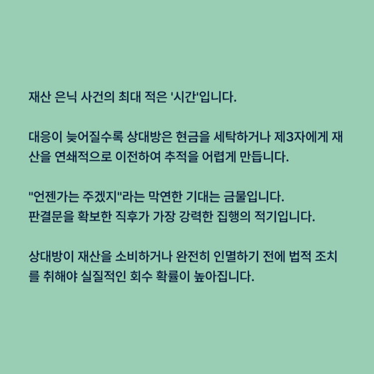 "언젠가는 주겠지"라는 막연한 기대는 금물입니다. 판결문을 확보한 직후가 가장 강력한 집행의 적기입니다. 상대방이 재산을 소비하거나 완전히 인멸하기 전에 법적 조치를 취해야 실질적인 회수 확률이 높아집니다.