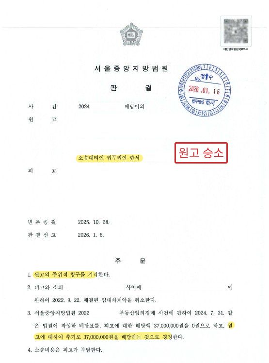 법무법인 한서는 본 사건에서 원고를 대리하여 배당이의 소송 전 과정을 수행하였습니다.
