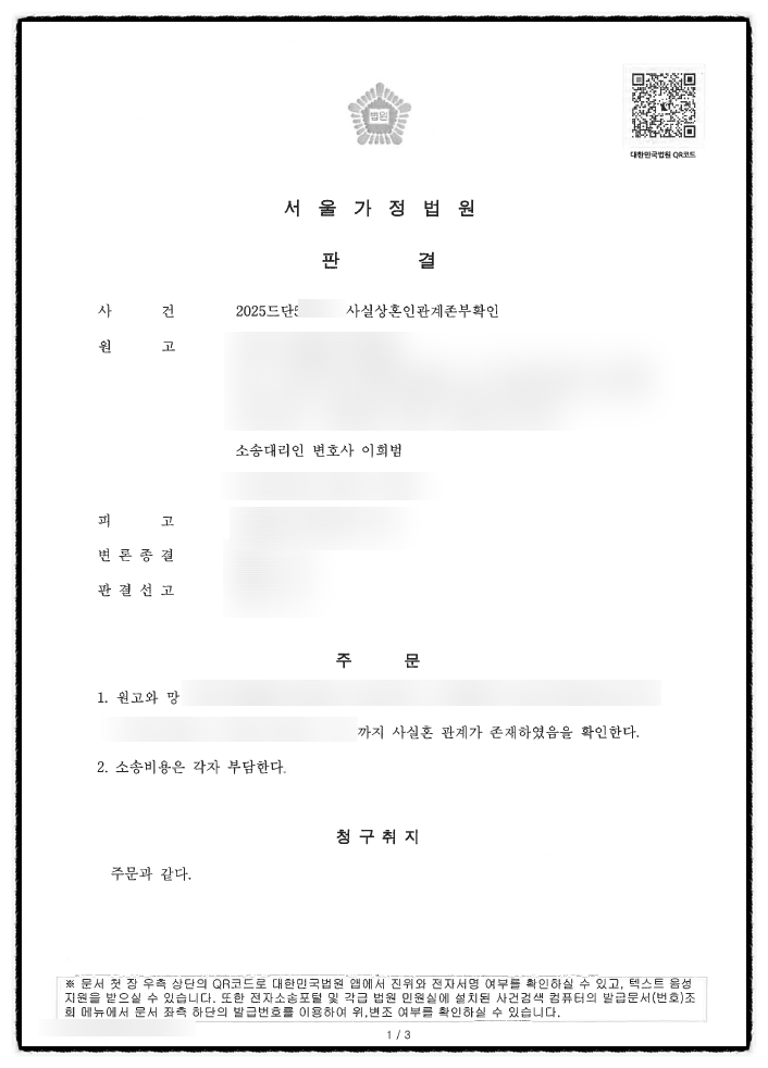 이에 따라 의뢰인은 사실혼 배우자로서의 법적 지위를 확인받게 되었습니다.