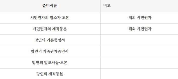 ※ 주의할 점은 국내 대리인이 직계혈족이 아닌 경우, 준비서류 발급이 불가하므로 미리 해외거주 상속인으로부터