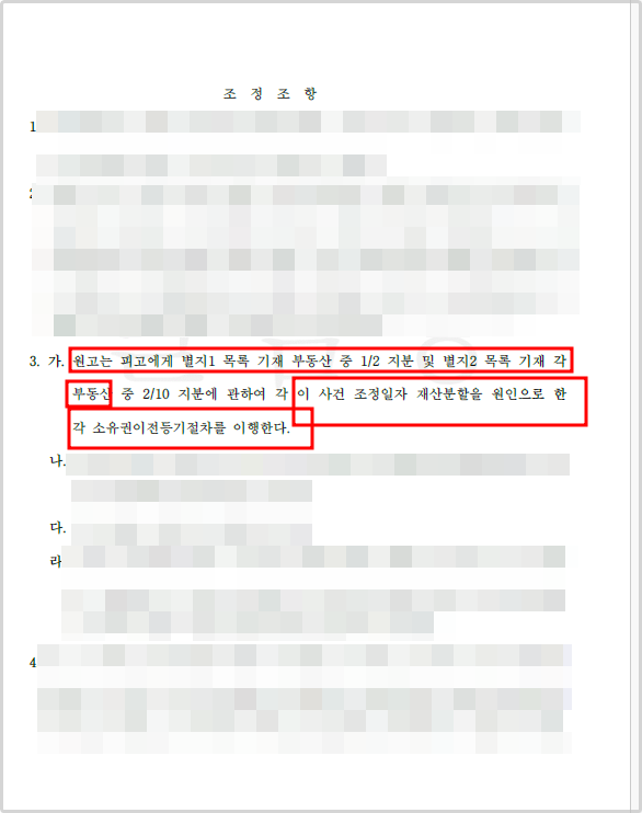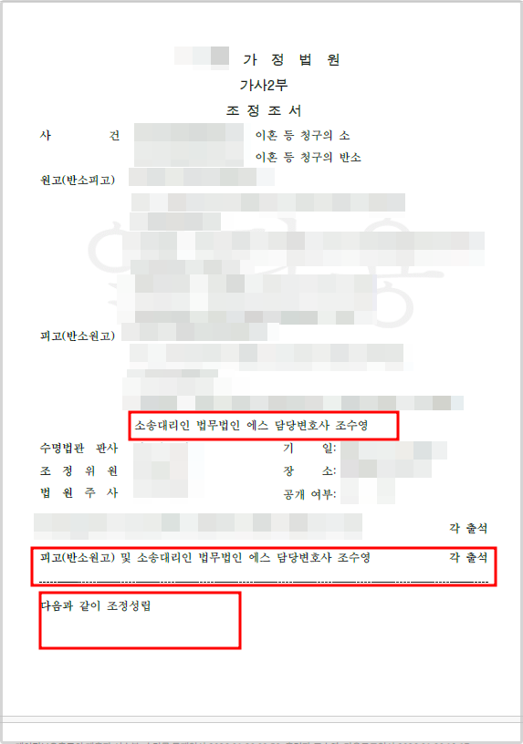 제가 위 조정안을 제안하자, 아내분은 처음에는 거절하였으나 성수동 건물이 실제 경매개시결정이 내려지고, 아내분 역시 서초구 아파트를 빨리 매각해야 할 상황에 처해지자 저희가 제안한 조정안을 받아 들이며 조정이 마무리 되었습니다.