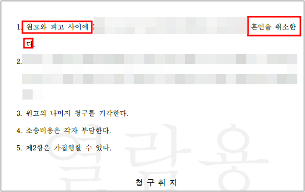 결국 법원에서도 저희 측 주장을 모두 받아들여 원고와 피고간 혼인에 이르게 된 데에는 피고의 중대한 기망행위가 있었고, 혼인취소의 제척기간이 도과되었다고 볼 수 없어 원고의 혼인취소를 인용해 주었습니다.