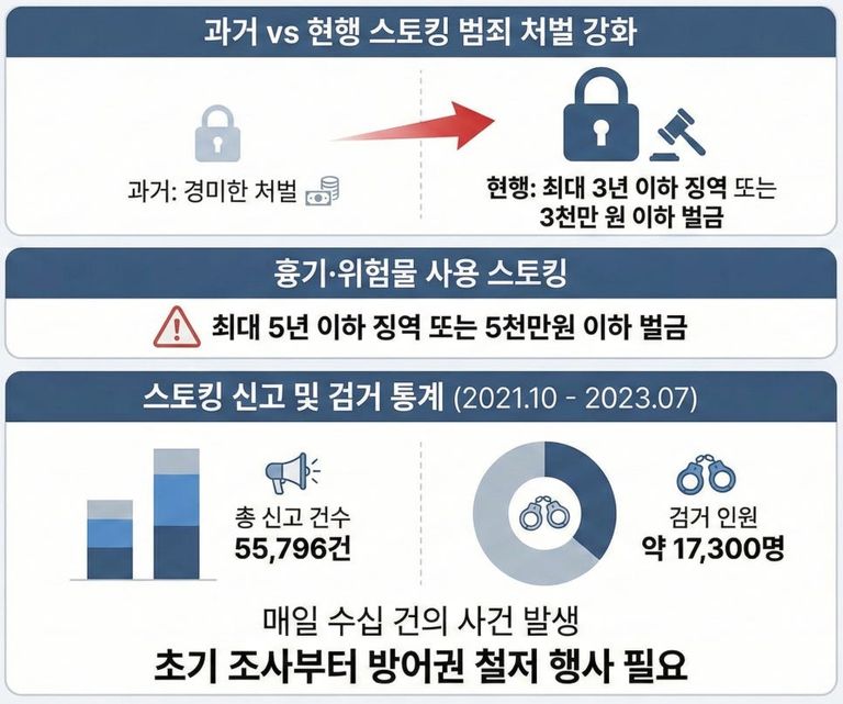 이렇듯 스토킹 혐의는 사회적 경각심이 높아 형사절차가 엄정하게 진행되며, 실패할 경우 무거운 형사처벌로 이어질 수 있습니다.