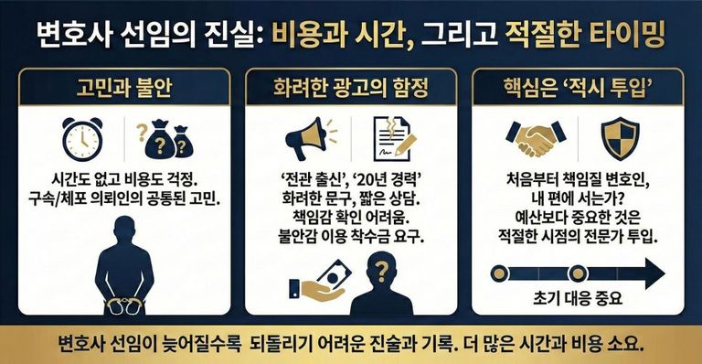 "누구나 실력있는 변호사를 선임하고 싶어하죠. 그런데 시간도 없고, 비용도 걱정입니다" 구속 또는 체포된 의뢰인 대부분이 고민하는 부분입니다.