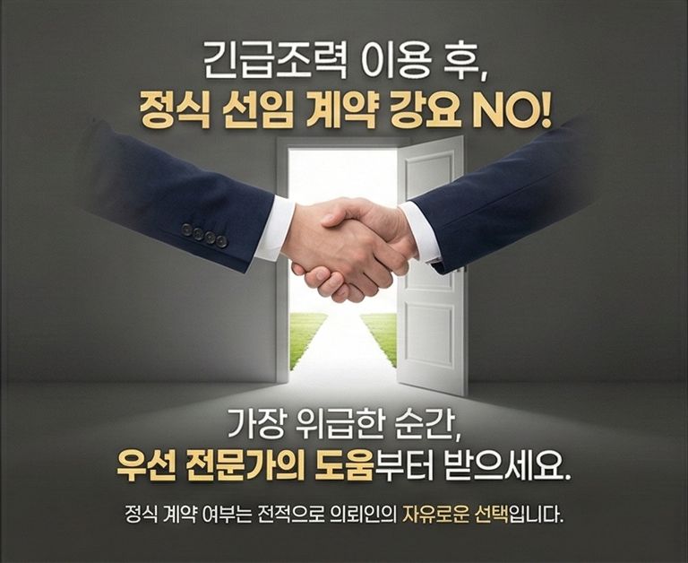 무엇보다 중요한 것은 이 긴급 조력 시스템을 이용한 뒤에도 정식 선임 계약을 반드시 해야 하는 것은 아니라는점입니다.