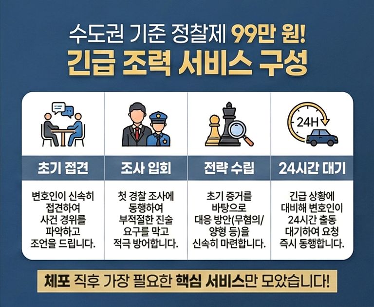 => 수도권 기준 정찰제 99만 원으로 체포·구속 초기부터 다음과 같은 서비스가 제공됩니다.