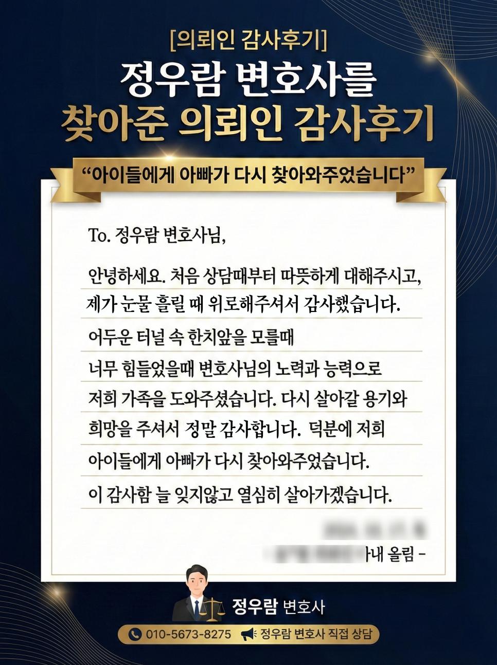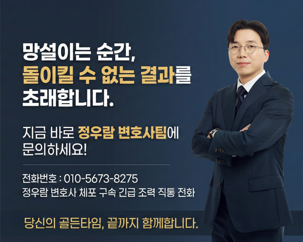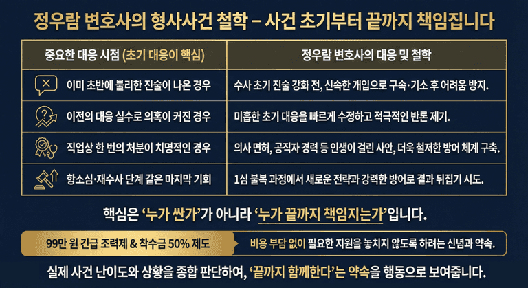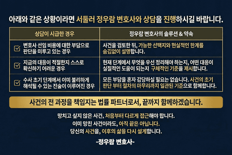 정우람 변호사팀은 골든타임에 필요한 조력을 우선 제공하며, 정식 계약 여부는 전적으로 의뢰인에게 맡깁니다.