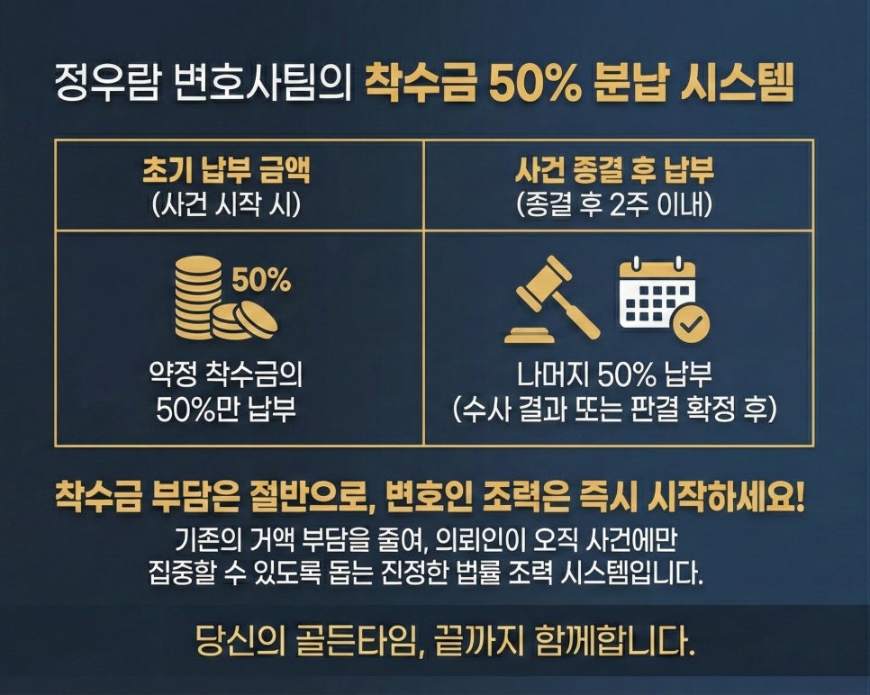 먼저 약정 착수금의 절반만 받으며 사건을 시작하고, 나머지 50%는 사건 종결 후(수사 결과 또는 판결 확정 후) 2주 이내에 완납할 수 있도록 하였습니다.