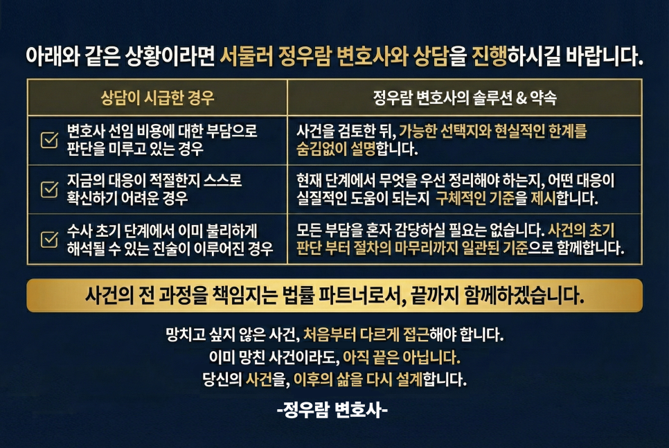 변호사 선임이 늦어질수록 이미 정리된 진술과 수사 기록은 되돌리기 어려워지고, 선택할 수 있는 대응의 폭도 자연스럽게 좁아집니다.