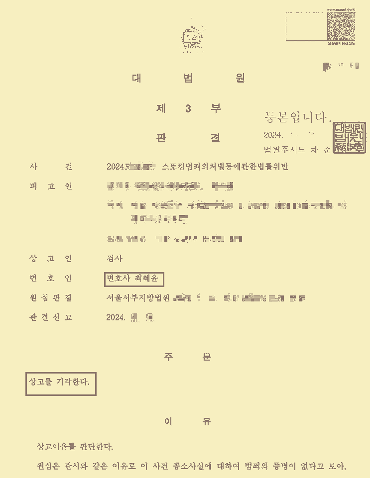 하지만 안타깝게도 경찰은 A의 행위를 스토킹범죄로 보아 송치결정하였고, 검사 역시 같은 의견을 가지고 벌금형으로 약식기소하였습니다. A는 정식재판청구를 하여 무죄를 주장했으나 1심 법원마저도 같은 판단을 하였습니다. 벌금이 많은 액수는 아니라 그대로 받아들일 수도 있었지만 항소를 진행했고 다시 스토킹범죄의 구성요건인 '지속성'의 법리적 해석에 관하여 적극 변론하였습니다.