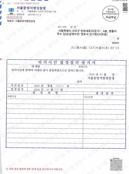 합의서 및 처벌불원서를 제출하면서 의뢰인에게 기소유예를 해달라는 취지로 변호인 의견서를 제출하였고, 검사로부터 기소유예 처분을 받았습니다.