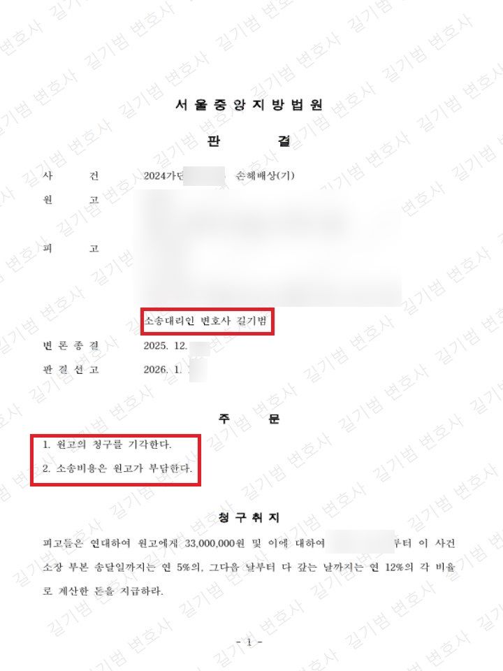 그러나 원고의 주장은 아무런 근거가 없었고, 변호사인 피고들이 불법행위를 한 사실 자체가 존재하지 않았습니다. 그 당연한 결과로 원고가 입은 손해도 존재할 수가 없는 사건이었습니다.