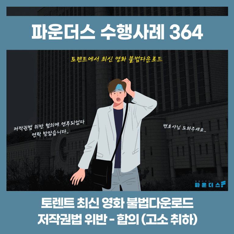 의뢰인은 토렌트(Torrent)를 이용해 최신 영화를 불법다운로드 및 유포로 저작권법 위반으로 문제되어 변호인의 조력을 요청했습니다.