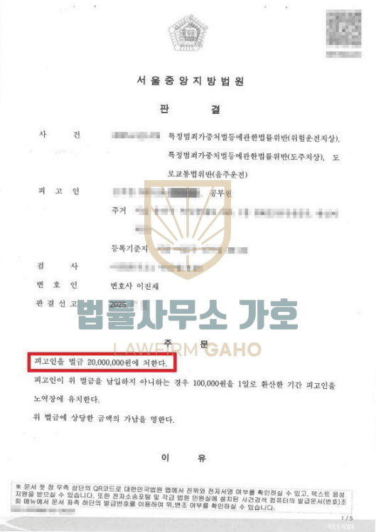 단순 음주운전이 아니고 택시차량파손과 인명피해까지 일으키고도 도주하였고 수사와 재판을 받던 중 2달만에 음주운전을 재차 저질러 적발되는 등 높은 확률로 실형 선고가 예상되는 사안이었으나, 포기하지 않고 끝까지 양형사유와 정상참작사유를 끌어모아 선처를 호소하였고 결국 실형을 면하는 것은 물론 벌금형만 받게 된 성공적인 사건이었습니다. 특히 가호에서 제공한 [전략적인 양형사유 가이드라인]이 주된 성공요인이었습니다.