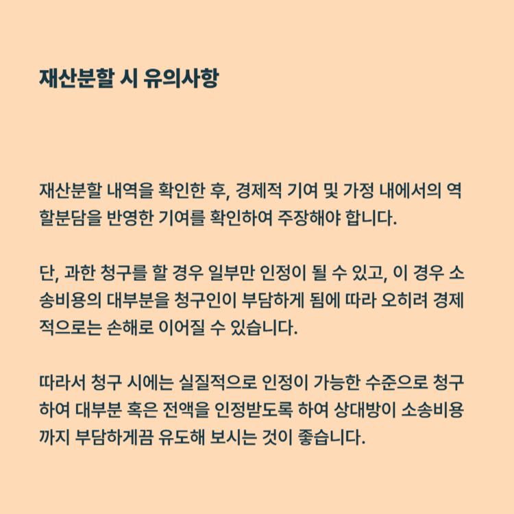 분할 가능한 재산에 무엇이 있는지 확인한 후에는 직접적인 경제적 기여 및 가정 내에서의 역할분담을 반영한 기여를 확인하고 주장할 수 있도록 해야 합니다. 이렇게 총 재산과 기여를 반영하여 재산분할금을 청구하는 것이 중요한데요. 너무 과한 청구를 할 경우 일부만 인정이 될 수 있으며 극히 일부만 인정이 된다면 소송비용의 대부분을 청구인이 부담하게 됨에 따라 오히려 경제적으로는 손해로 이어질 수 있습니다. 따라서 청구 시에는 실질적으로 인정이 가능한 수준으로 청구하여 대부분 혹은 전액을 인정받도록 하여 상대방이 소송비용까지 부담하게끔 유도해 보시는 것이 좋습니다.