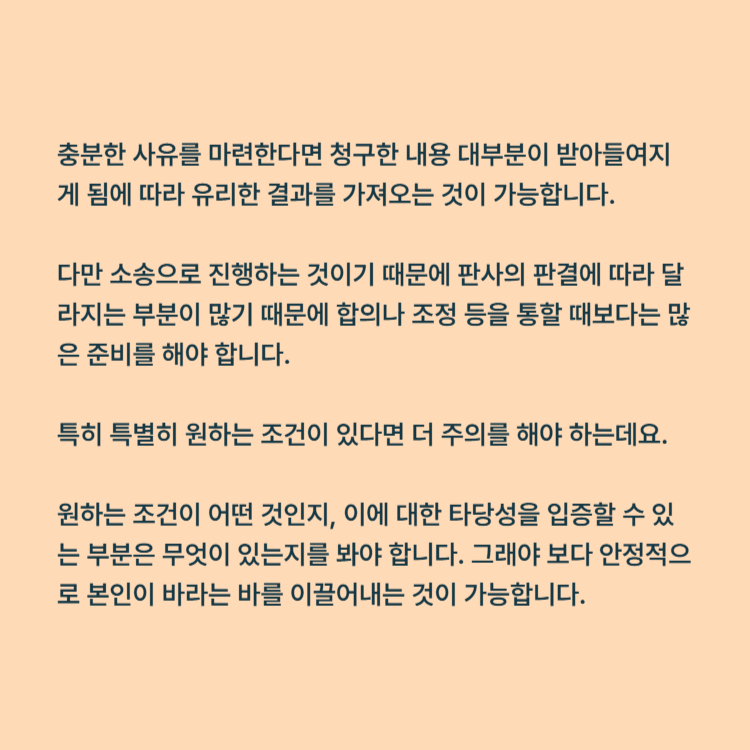 특히 특별히 원하는 조건이 있다면 더 주의를 해야 하는데요. 원하는 조건이 어떤 것인지, 이에 대한 타당성을 입증할 수 있는 부분은 무엇이 있는지를 봐야 합니다. 그래야 보다 안정적으로 본인이 바라는 바를 이끌어내는 것이 가능합니다. 만일 혼자 소송을 진행하는 것이 어렵다고 판단이 된다면 변호사를 선임하고 법적 자문을 받아 원하는 결과를 이끌어내 보시기 바랍니다.