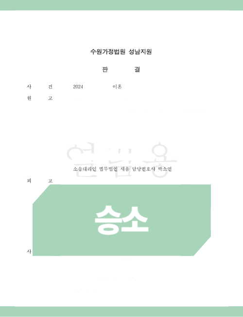 이와 같이 대응한 결과 청구한 재산분할 금액을 전부 인정 받는 등 상당한 성과를 단기간 내에 이끌어낼 수 있었습니다. 또한 이혼 거부 배우자로 인해 이전에 의뢰인 혼자 1년 동안 사건을 이끌어갔던 것과 달리 사건 수임 후 5개월 내로 사건을 종결시키는 등의 많은 도움을 드릴 수 있었습니다.