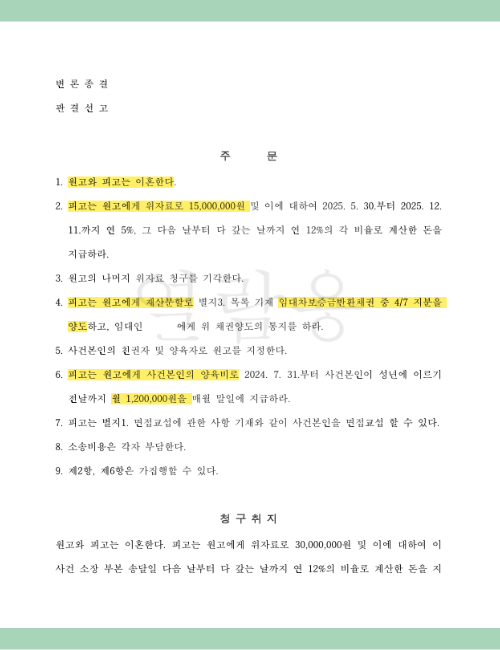 특히 재산 분할 같은 경우에는 단순히 금전적인 지급만을 원하는 것이 아니라 특정한 동산이나 채권의 양도를 희망하는 경우가 있기 때문에 A씨의 원하는 방향을 면밀하게 파악하고 이를 반영하고 검토하여 유리한 결과를 이끌어낼 수 있도록 대응하였습니다.
