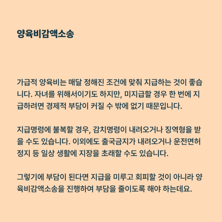 양육비는 꾸준하게 매달 정해진 조건에 맞춰 지급하는 것이 좋습니다. 자녀의 복리를 위해서이기도 하지만 나중에 한 번에 과거 미지급된 것들을 한 번에 지급하려면 경제적인 부담이 클 수 있으며, 무엇보다 지급을 하지 않은 경우 상대방이 법적인 조치를 함에 따라 감치명령이 내려오거나 벌금 혹은 징역이 내려오기도 합니다. 이외에도 출국금지가 내려오거나 운전면허정지 등 강도 높은 제한이 내려올 위험이 높습니다. 그렇기에 부담이 된다면 지급을 미루고 회피할 것이 아니라 양육비감액소송을 진행하여 부담을 줄이도록 해야 하는데요.