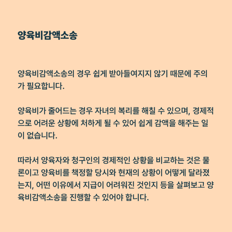 양육비감액소송의 경우 쉽게 받아들여지지 않기 때문에 주의가 필요합니다. 양육비가 줄어드는 경우 자녀의 복리를 해칠 수 있으며, 경제적으로 어려운 상황에 처하게 될 수 있어 쉽게 감액을 해주는 일이 없습니다. 따라서 양육자와 청구인의 경제적인 상황을 비교하는 것은 물론이고 양육비를 책정할 당시와 현재의 상황이 어떻게 달라졌는지, 어떤 이유에서 지급이 어려워진 것인지 등을 살펴보고 양육비감액소송을 진행할 수 있어야 합니다.