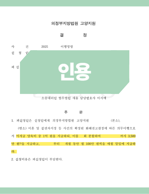 양육비지급명령의 경우 이미 확정된 판결문이었고, 집행력이 있는 사안이었습니다. 그렇기에 최대한 A씨의 경제적인 상황이나 개인적인 사정 등을 강조하여 양육비의 감액을 유도하고 양육비분할납부를 유도하는 것이 필요했습니다. 이에 법무법인 새움에서는 A씨가 극심한 경제적 고통을 겪고 있음을 호소하는 내용의 서면을 수차례 제출하였습니다.