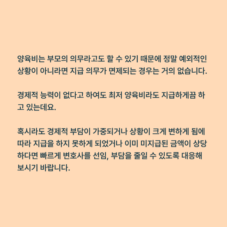 이렇게 양육비 관련 분쟁에 대응하는 방법에 대해서 알아보았습니다. 양육비는 부모의 의무라고도 할 수 있기 때문에 정말 예외적인 상황이 아니라면 지급 의무가 면제되는 경우는 거의 없습니다. 경제적 능력이 없다고 하여도 최저 양육비라도 지급하게끔 하고 있는데요. 혹시라도 경제적 부담이 가중되거나 상황이 크게 변하게 됨에 따라 지급을 하지 못하게 되었거나 이미 미지급된 금액이 상당하다면 빠르게 변호사를 선임, 부담을 줄일 수 있도록 대응해 보시기 바랍니다.