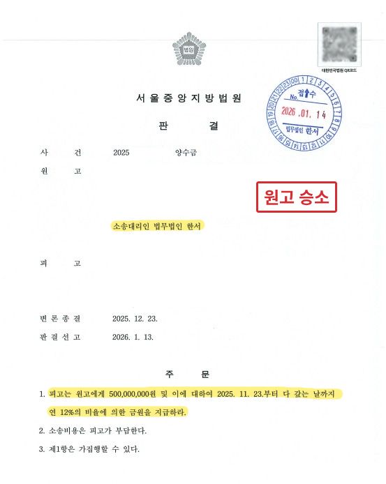 법무법인 한서는 본 사건에서 원고를 대리하여 양수금 소송 전 과정을 수행하였습니다.