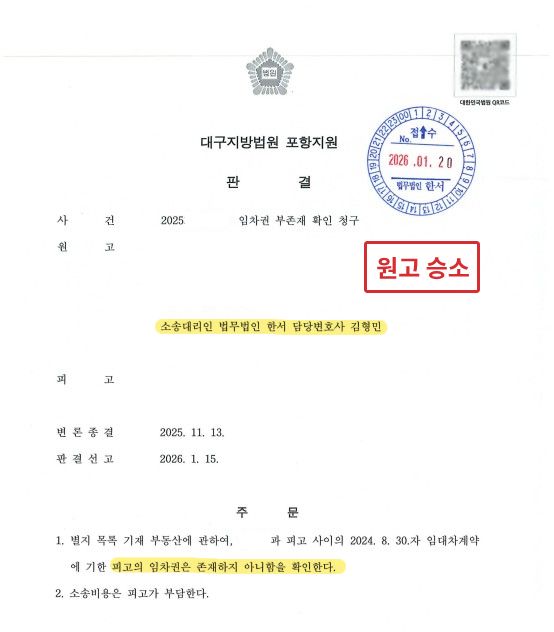 법무법인 한서는 본 사건에서 원고를 대리하여 임차권 부존재 확인 소송 전반을 수행하였습니다.