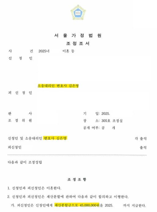 조정 결과, 배우자 또한 원만한 조정을 원한다는 의뢰인의 진심을 받아들였고, 막 대학생이 된 자녀 부양의 의미로 별거 전 의뢰인으로부터 지원받은 금원만큼 재산분할로 정산하며 조정 성립하였습니다. 의뢰인은 법리적으로 주장하기는 어려운 청구였지만, 조정 절차를 이용하여 원하는 결과를 이끌어 낸 데에 만족하셨습니다.