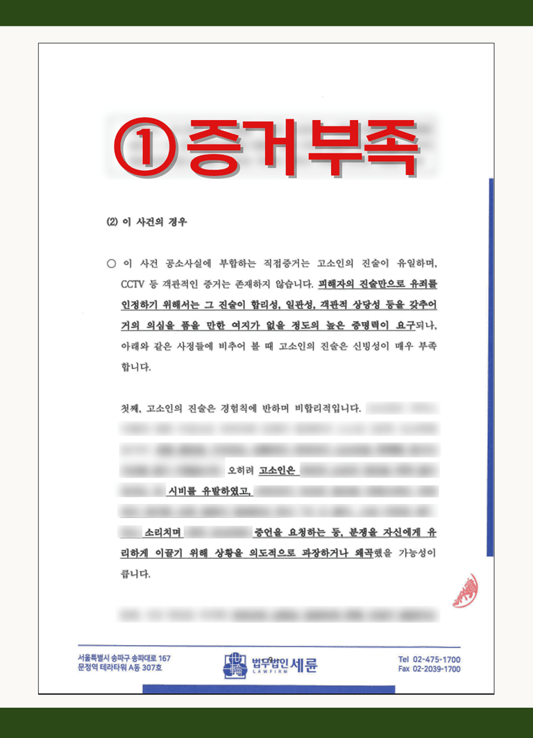 고소인의 진술이 유일한 증거인 상황에서, 그 진술이 일관되는지, 과장되거나 왜곡된 부분은 없는지를 하나하나 짚었습니다. 특히 사건 직후 고소인이 주변 사람들에게 증인을 요청한 정황, 분쟁을 확대시킨 행동 등을 근거로 진술의 신뢰성을 적극 다투었습니다.