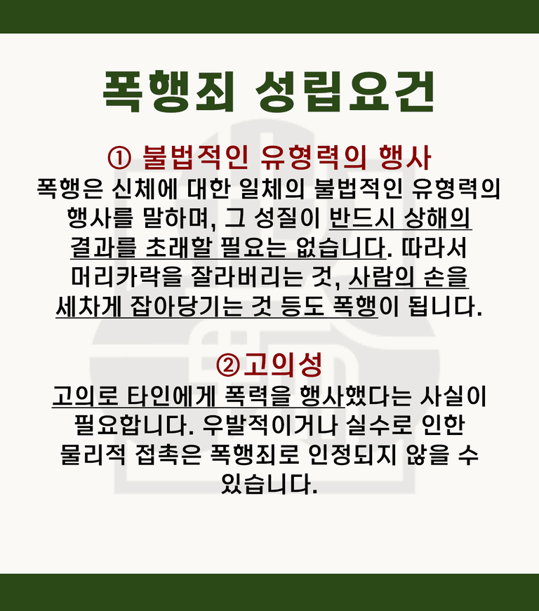 그리고 이러한 유형력은 상대방을 다치게 할 목적 즉, '고의성'을 가지고 행사하였는지도 중요한 기준이 되는데요. 검사출신 변호사 역시 먼저 확인하는 부분은 “이 접촉이 과연 폭행죄의 구성요건에 해당하는가”입니다.