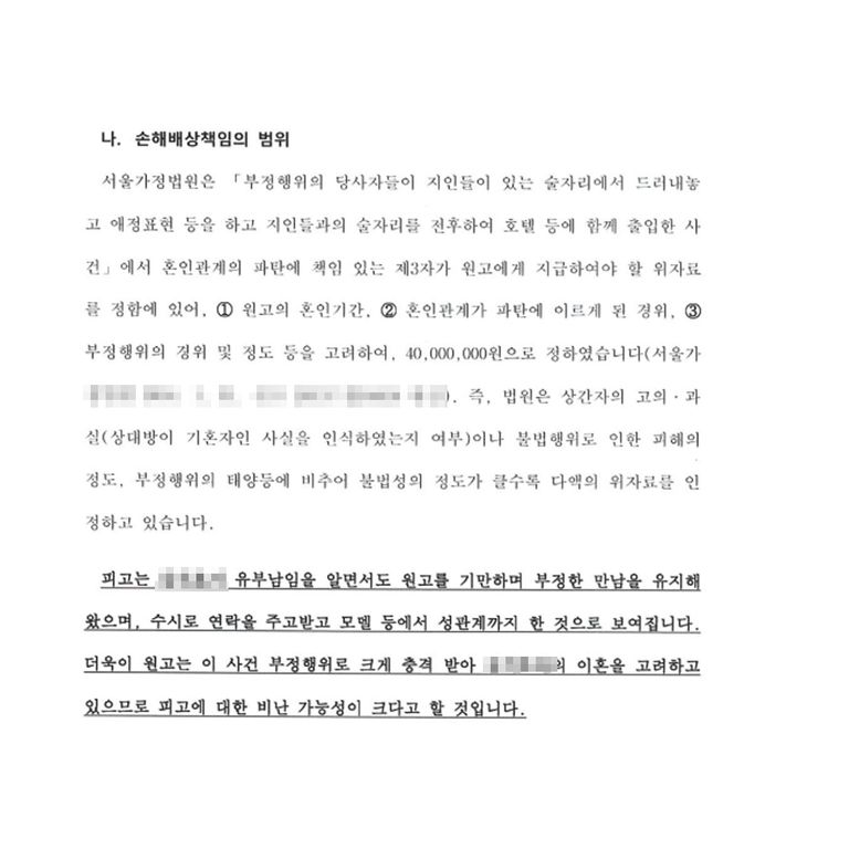 이에 따라 길변은 두 사람이 주고 받은 문자 메시지와 숙박업소 예약내역 및 해당 업소의 cctv를 확보하여 증거로 제출하였는데요.