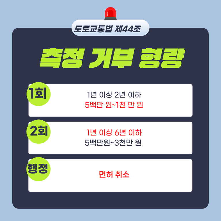 도로교통법 제44조에 의하면 술에 취해서 차를 몰거나, 음주 측정에 불응하였을 시 처벌을 받게 된다고 나와 있습니다. 이때 횟수 및 혈중 알코올 농도에 따라 적용되는 형량이 다르다는 점을 인지하셔야 합니다.